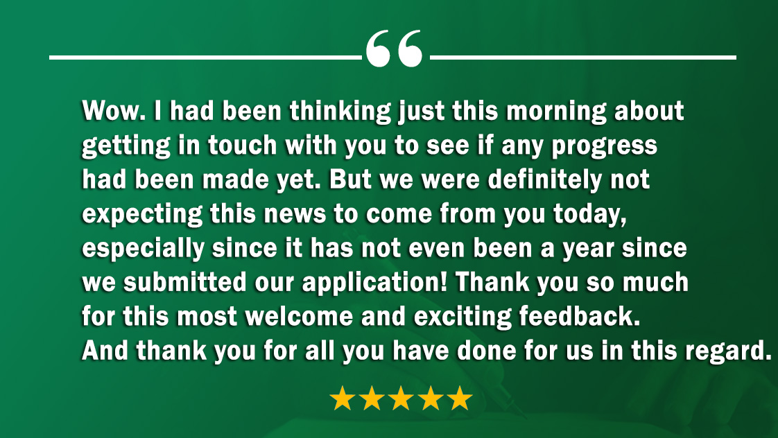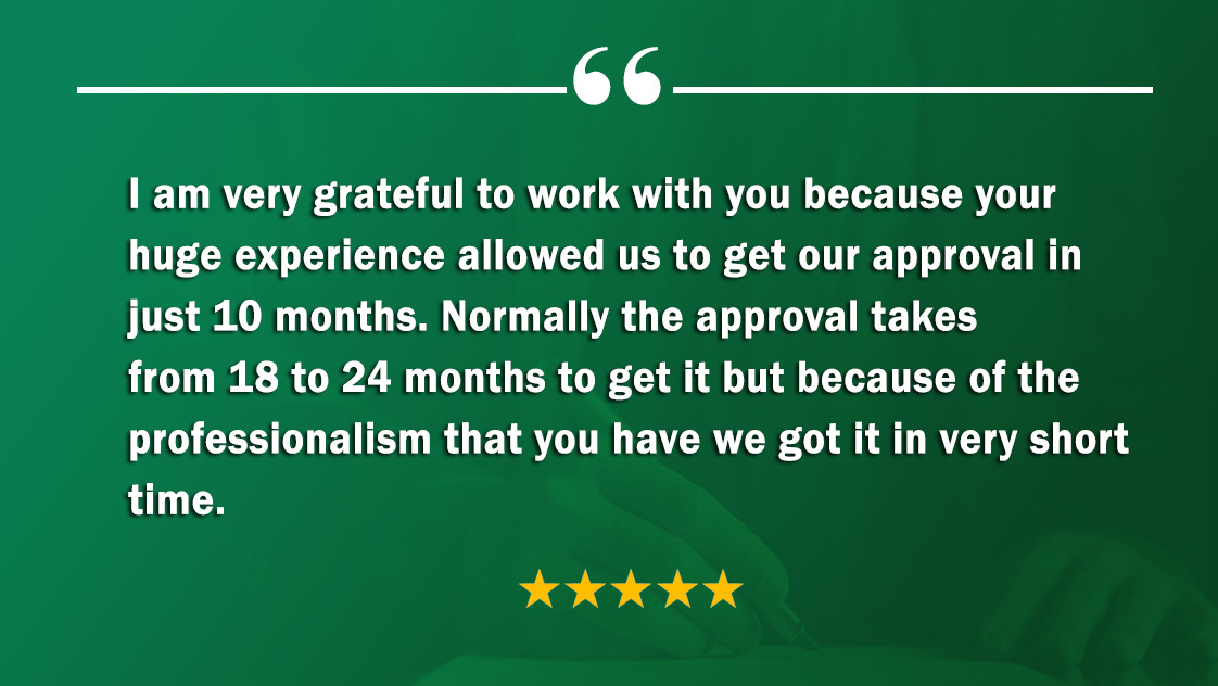 I am very grateful to work with you because your huge experience allowed us to get our approval in just 10 months. Normally the approval takes from 18 to 24 months to get it but because of the professionalism that you have we got it in very short time.