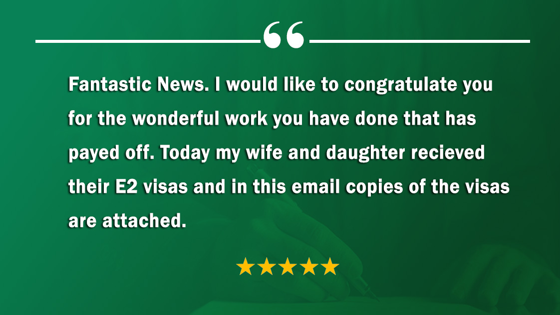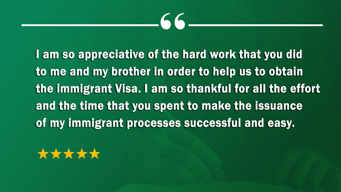 I am so appreciative of the hard work that you did to me and my brother in order to help us to obtain the immigrant Visa. I am so thankful for all the effort and the time that you spent to make the issuance of my immigrant processes successful and easy.